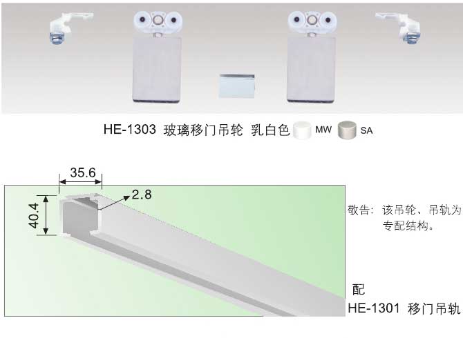 HE-1303玻璃移門吊輪系列獨(dú)具承重量大,噪音低,安裝方便,易于調(diào)節(jié)定位。適用于10mm、12mm鋼化玻璃門的安裝。