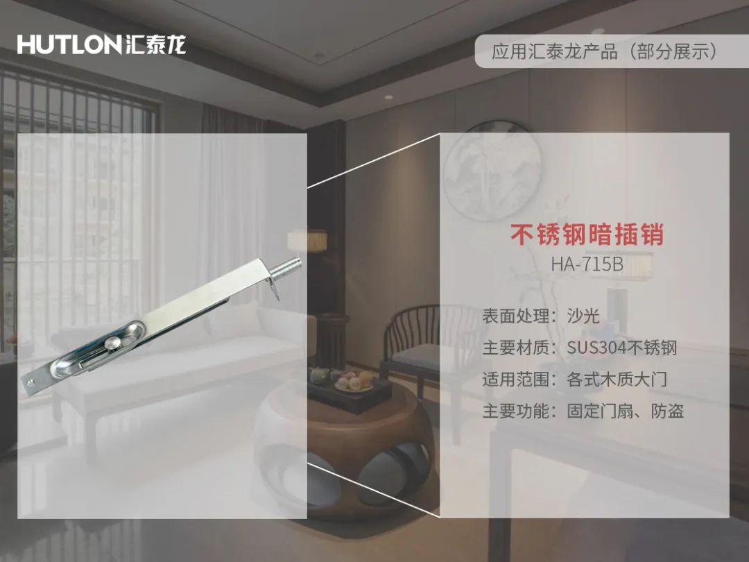 在門五金方面,匯泰龍為嵊州賓館選配了不銹鋼合頁、暗插銷、防塵器、防盜鏈、門底密封條等產(chǎn)品,以滿足門扇承重、室內(nèi)安全、防塵、隔音等客房場(chǎng)景的使用需求。