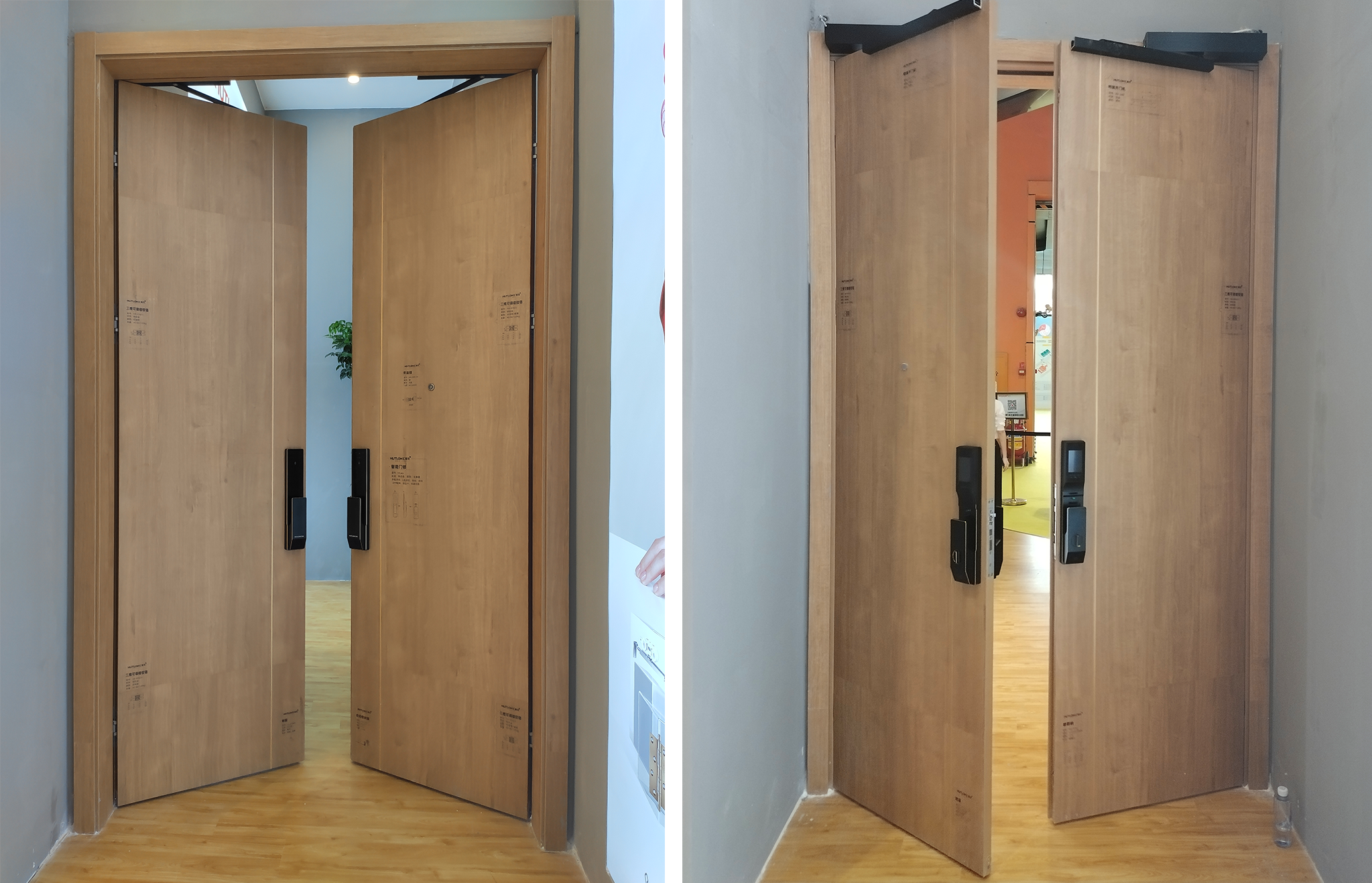 展館的入口,特設雙開大門,展示體驗匯泰龍智能門鎖/門五金解決方案。搭配匯泰龍V3pro全自動3D人臉貓眼鎖,主人靠近,紅外感應自動開啟人臉識別,識別成功自動開鎖,閉門器自動開門,隨后延時自動關門,全程無需動手,尊享高端體驗,科技格調滿滿。