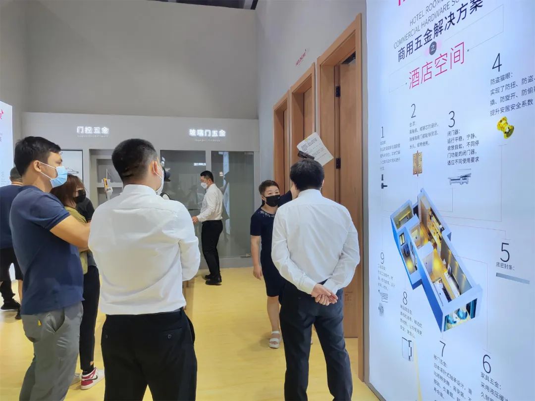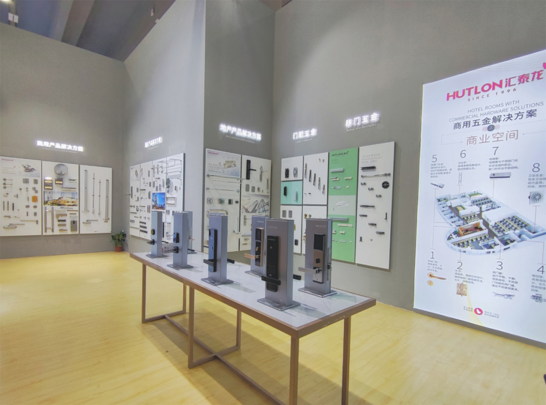 匯泰龍展館的商用五金專區,詳盡地展示了商業解決方案、酒店解決方案、地產解決方案三大方案,并精選出下游工程客商最為關注的玻璃門五金、門控五金、移門五金等專項解決方案進行展示。