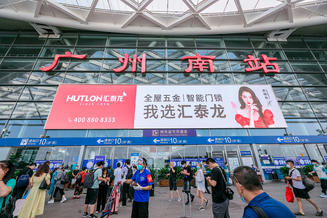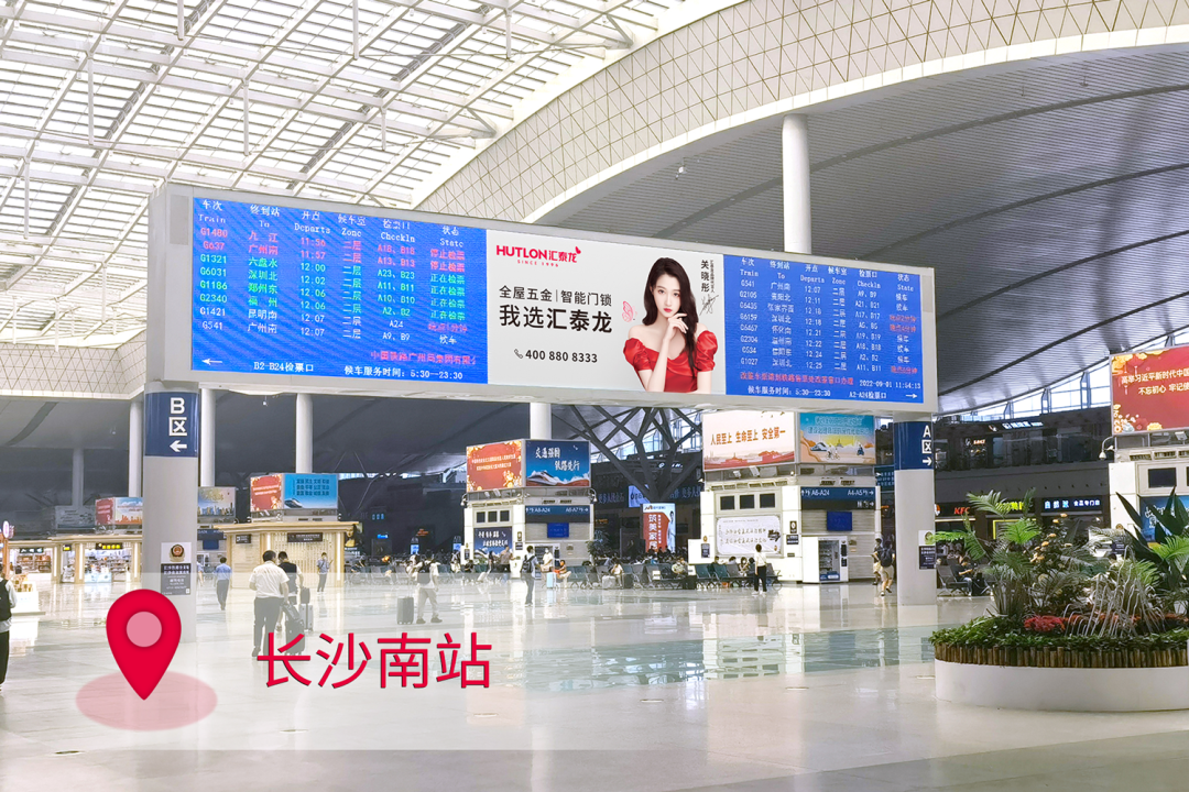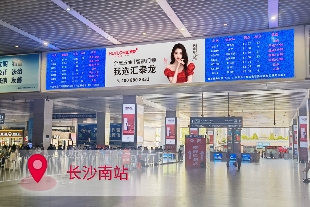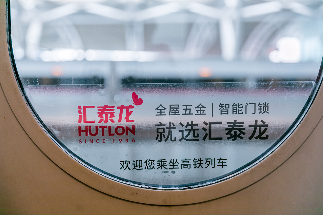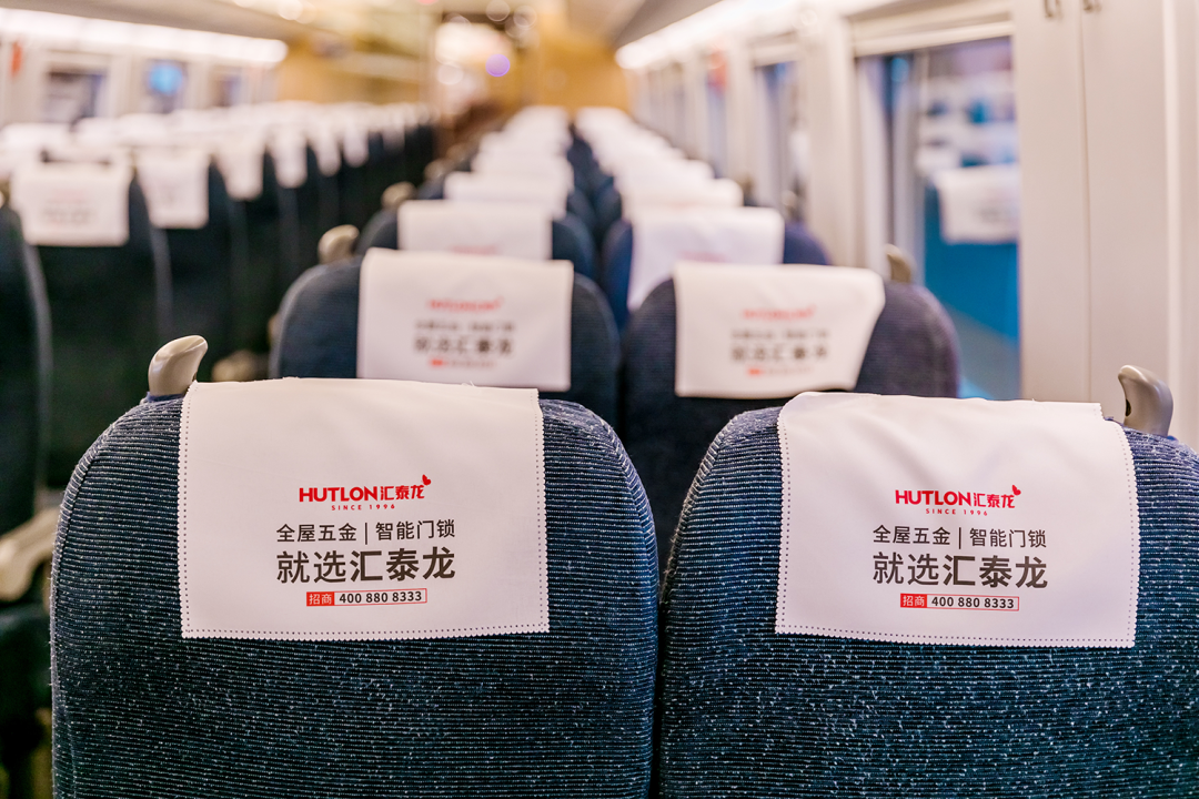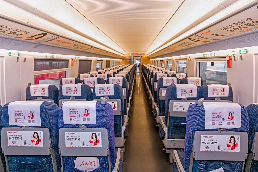 在站臺,作為“第一眼印象媒體”和乘客上下車必看媒體,外車身貼匯聚了站內(nèi)旅客極大的關注度。匯泰龍冠名高鐵列車,整車8節(jié)車廂兩側(cè),均印有匯泰龍logo+“全屋五金丨智能門鎖”,沿途城市皆可展現(xiàn),高效傳達品牌形象,強化記憶。