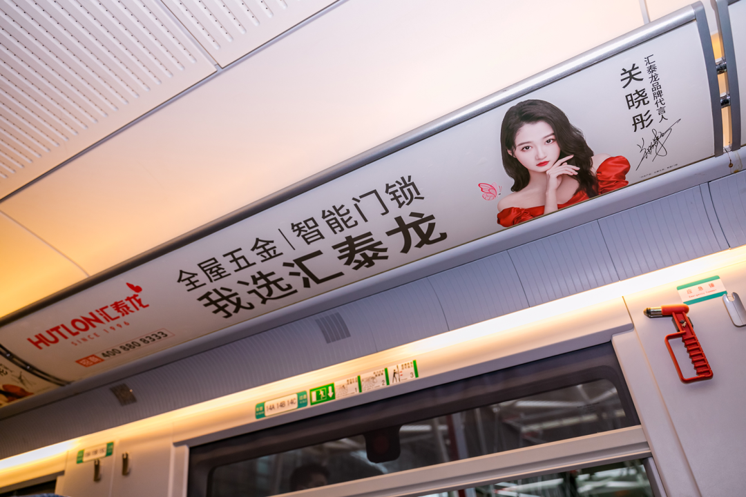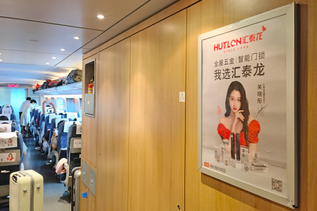 車廂內(nèi),報站語音廣播廣告、以及匯泰龍品牌代言人關曉彤KV廣告遍布在門貼、海報、頭枕、桌板、品牌長廊、LED字幕等車內(nèi)多元化、視聽結(jié)合的全媒體廣告,多方位、高頻次傳播“全屋五金丨智能門鎖 我選匯泰龍”,構(gòu)建起匯泰龍品牌專屬的全方位傳播空間,也是穿梭在祖國大地上一道靚麗的品牌風景線。