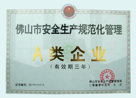專家組自2009年10月對我司安全生產規范化管理工作作綜合評估,對我司安全生產管理相關的記錄資料進行了詳細的審核,同時專家組也親臨生產現場進行了嚴謹的安全生產工作考察,并且現場宣布了評定我司為佛山市安全生產規范化管理A類企業審核。