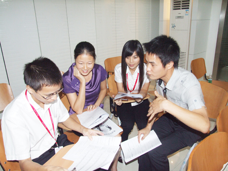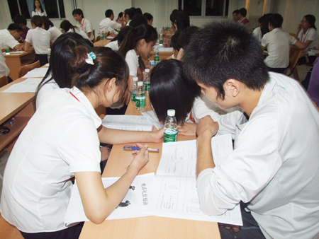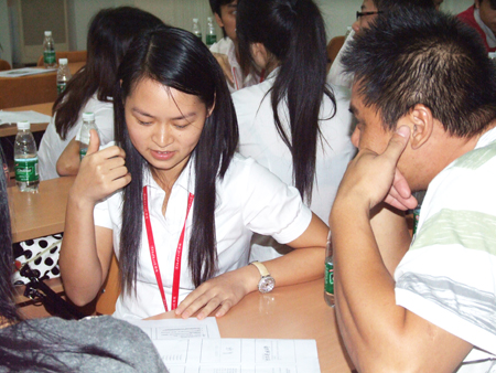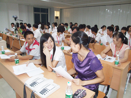 上半節的課程結束后,下半節課程主要由全體學員自由演練。學員們每四人分為一組分角色扮演,現場情景演練,同時對每一個情景邀請了臺下的小組上臺為大家表演,幽默的情景劇讓學習現場笑聲不斷,老師又把大家從表演的細節觀察中引入到學習里,通過大家在臺上的現場表演,臺下的觀眾踴躍提出問題。在工作中沒有注意到的細節問題都一一被現場的學員現場指正出來,整個學習氣氛非常活躍。