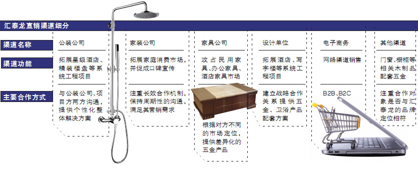家具制造企業渠道,匯泰龍這個渠道做了更進一步的細分。使用進口部件的家具廠,用最具性價比的產品促成合作;生產酒店配套、工程配套家具的企業,他們對質量的要求更高,而且對種類的要求比較多,這是最適合匯泰龍產品胃口的客戶,產品的高端品質往往能一下子擊中對方的心坎;專業生產高檔家具的企業,產品主要銷往歐美,該類企業對五金產品的質量要求最高,匯泰龍采用的措施是提供局部配套產品,做好,做精,以此滿足其個性化需求。