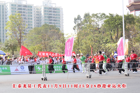 “亞運加油!中國加油!匯泰龍加油!”,2010年11月9日11時25分28秒,當(dāng)?shù)?55棒火炬手經(jīng)過廣州著名標(biāo)志性建筑—廣州塔時,藝洲路上的匯泰龍員工迎火炬代表方隊響起了潮水般的歡呼聲,氣氛熱烈。四十多名匯泰龍員工手舞國旗、公司旗,舉起寫滿著匯泰龍員工簽名橫副,滿載著全體匯泰龍人對亞運的祝福,在大道旁為火炬手歡呼鼓勁,為亞運圣火傳遞助威!