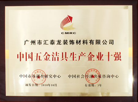 201011月,由中國市場調查研究中心和中國社會經濟決策咨詢中心聯合組織的“中國五金潔具生產十強企業、中國五金潔具生活十大暢銷品牌”的評比活動結果揭曉,匯泰龍公司榮膺“中國五金潔具生產企業十強”、“中國五金潔具生產十大暢銷品牌”的稱號,并獲得證書和獎牌。這是匯泰龍公司再一次榮獲全國性的獎項,標志著企業品牌進一步得到行業及消費者的充分認可。此次的評選結果將在《中國日報》和國家質檢總局主管、中國質檢報刊社主辦的中國品牌雜志社以及中國市場調查研究中心、中國社會經濟決策咨詢中心官方網站予以公布。