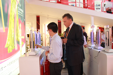 工作人員通過先進的電子儀器為客商演示匯泰龍產品系列
