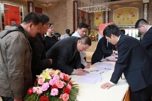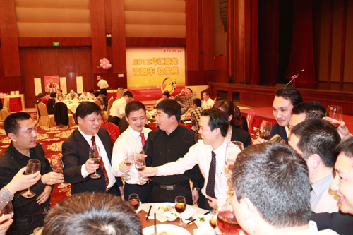 3月20日17:00,在全國經銷商陸續到達廣東佛山三水綠湖酒店后,大家共同合影留下了美好的全家福大合影。隨即,龍情相約酒會開始。酒會現場,公司董事長陳鴻填先生在激昂喜慶的音樂聲中走上主題背景臺,發表了熱情洋溢的祝酒詞。他首先表達了對經銷商遠道而來的熱烈歡迎,接著向大家總體介紹了匯泰龍2011年在行業內取得的突出成績,最后,陳董表達了全體經銷商共同攜手、相互合作、共創佳績的愿望。酒會中,陳董、徐總以及匯泰龍高層管理團隊一同輪流向每一桌遠道而來的經銷商祝酒,整場酒會氣氛溫馨,經銷商們舉杯同慶,在相互的祝愿和經驗交流中,將酒會氣氛一次次推向了高潮。