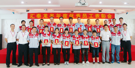 7月20日,匯泰龍佛山南海生產基地辦公樓五樓會議廳聲樂交響、燈火通明,匯泰龍2012年度第二季度優秀員工(七級員工)表彰大會隆重召開。公司人事行政中心總監任志平先生、制造中心生產管理部經理張祖林先生、各車間主任及優秀員工到會,會議上任總監首先發表了講話,他在演講中提到,一個優秀的企業離不開每一個優秀的團隊,優秀的團隊的品質必須由每一位優秀品質的員工才能體現,受表彰的幾位優秀員工在平凡的崗位上兢兢業業,足以成為匯泰龍人學習的榜樣,接著他宣讀了《2012年度第二季度優秀員工名單》,公司領導對這些經民主投票評選出的優秀員工進行頒發榮譽證書并進行表彰,獲獎員工覃云清、李登芳代表全體優秀員工發言,最后,所有嘉賓與優秀員工合影留念。表彰大會氣氛熱烈,在圓滿完成會議議程之后,表彰大會隆重閉幕。