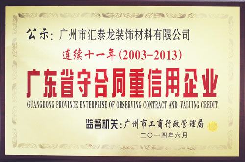 2014年6月,廣州市工商行政管理局對獲得“守合同重信用”的廣州匯泰龍裝飾材料有限公司等企業進行表彰,此次是匯泰龍公司連續十一年獲得“守合同重信用企業”稱號。同時被廣州市越秀區企業信用促進會評為理事單位,并頒發了牌匾及榮譽證書。這是對匯泰龍公司守法經營、依法納稅、講究信用、誠信經營、品牌影響的充分肯定