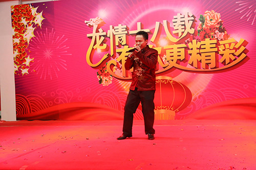 在四位主持人的引導下,陳董上臺發表新年賀辭,他首先向大家總結了我們在2014年取得的成績,對一年來全體匯泰龍人的付出和努力表示感謝,同時,他指出2014年受房地產行業的影響,整個家居建材行業都很嚴峻,我們匯泰龍公司全體同仁齊心協心仍然取得了一定的成績。面對2015年,我們通過轉型、一系列變革等措施,一定會繼續發力,再創匯泰龍的輝煌。最后,他熱情洋溢地表達了對在場所有員工和員工家人新年的祝福,在場的員工深受鼓舞,報以雷鳴般的掌聲。
