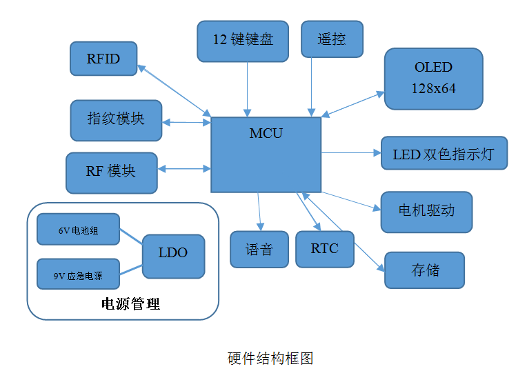 HZ-69206電控系統(tǒng)由主處理微控制器(MCU)、電源管理、非接觸M1卡讀取模塊(RFID)、顯示部分(OLED)、實(shí)時(shí)時(shí)鐘(RTC)、指紋讀取識別模塊、語音播放控制部分、遙控器接收模塊、信息存儲部分和狀態(tài)指示燈等部分組成,電控系統(tǒng)架構(gòu)圖如下,整體電路集成度較高,電路設(shè)計(jì)模塊化構(gòu)成,易于生產(chǎn)、維護(hù)提高產(chǎn)品的穩(wěn)定性。