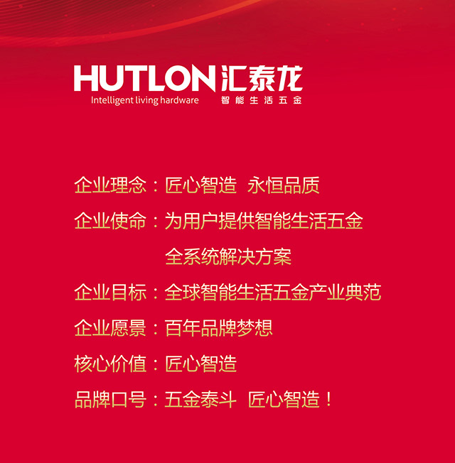 匯泰龍品牌走過二十周歲之際,智能家居時代賦予匯泰龍新的使命和定義:打造國際高端智能生活五金第一品牌!匯泰龍正式全面推出新CIS形象,旨在推動五金智能化發展,將智能真正融入生活五金中,為消費者創造智能家居生活。延續求實、向上、敬業、和諧的文化根基,傳承匯泰龍20年輝煌底蘊及品牌影響力。