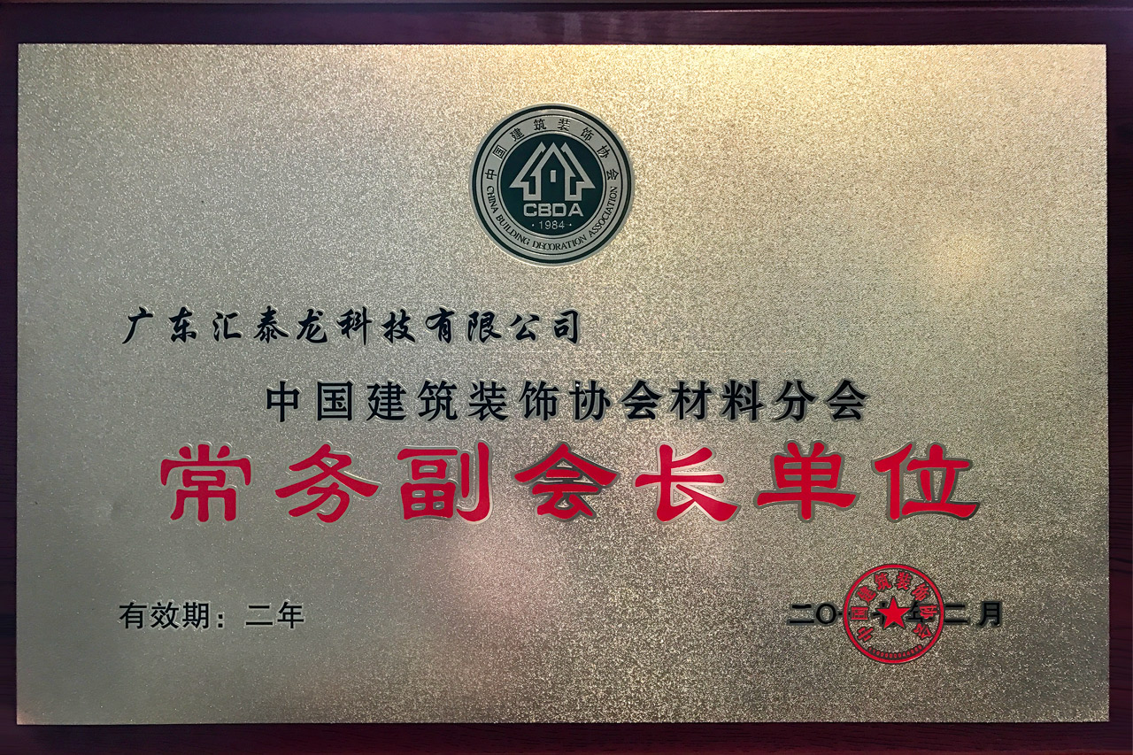匯泰龍公司以其先進的研發能力,極高的技術水平及強大的行業領域影響力、市場占有率和良好的口碑,獲得了消費者的好評和業界同仁的一致認可,連任「中國建筑裝飾協會材料分會常務副會長單位」,匯泰龍董事長陳鴻填先生受聘為「中國建筑裝飾協會材料分會常務副會長」,同時匯泰龍榮膺「2017年度中國建筑裝飾協會材料分會優秀會員單位」。