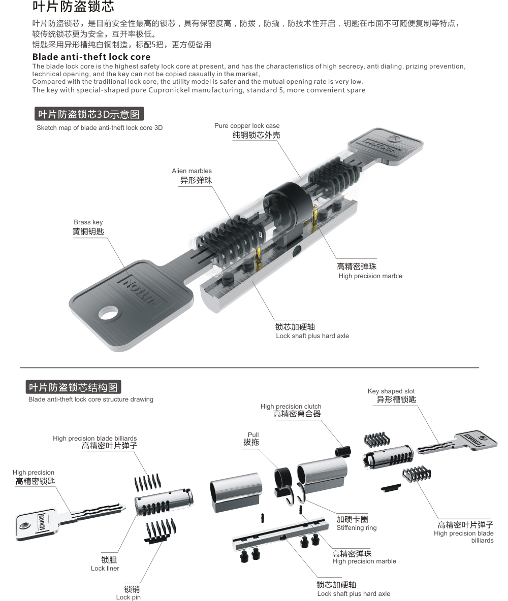 HD-T2-105P1K C級雙核多軌道空轉防盜鎖芯
